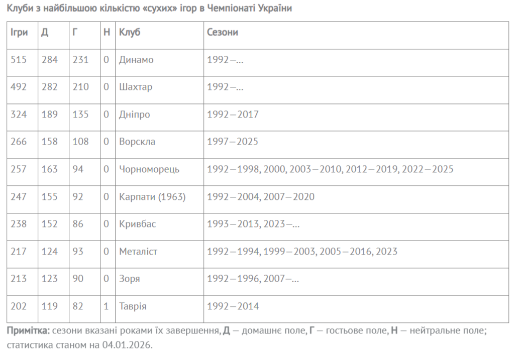 За всю ж історію чемпіонату України найчастіше не пропускали голи воротарі "Динамо" — у 515-ти матчах. До солідної ювілейної відмітки у 500 "сухих" матчів поступово наближається "Шахтар" (наразі — 492).