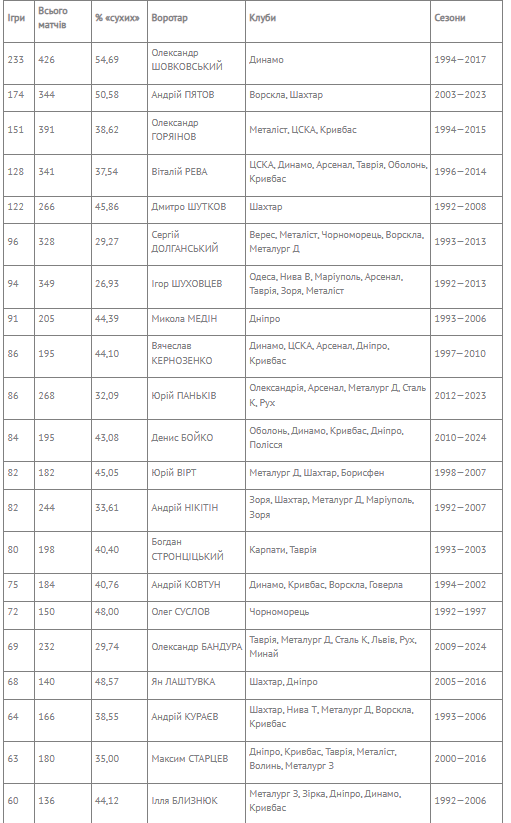 Воротарі з найбільшою кількістю «сухих» ігор в Чемпіонаті України (1992—2025)