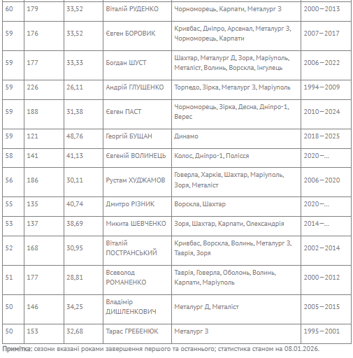 В першій частині сезону 2025/26 відбулася невелика ротація серед воротарів, які провели не менше 50 «сухих» матчів в історії Чемпіонату України.