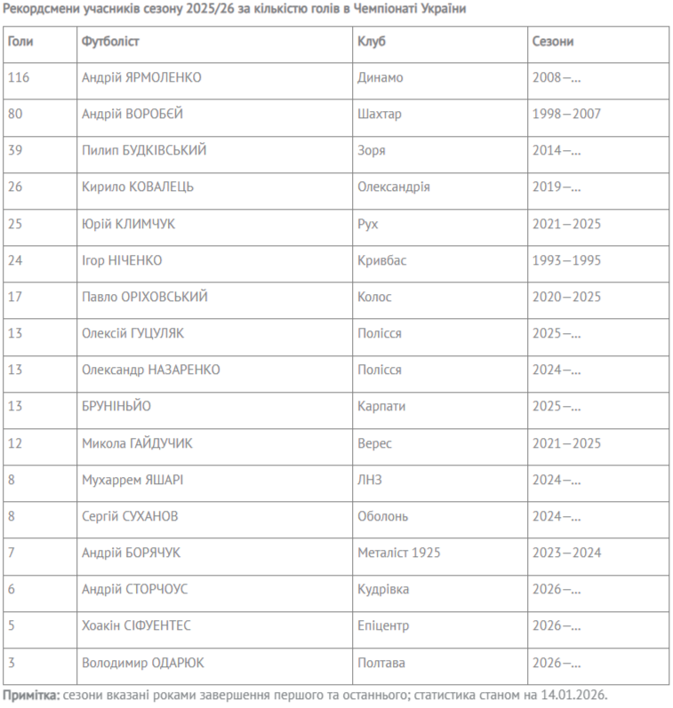 В сезоні 2025/26 підняли планку клубних рекордів серед бомбардирів у чемпіонаті України одразу двоє: Андрій Ярмоленко ("Динамо") та Пилип Будківський ("Зоря"). Вони і були найкращими бомбардирами своїх клубів перед стартом сезону.
