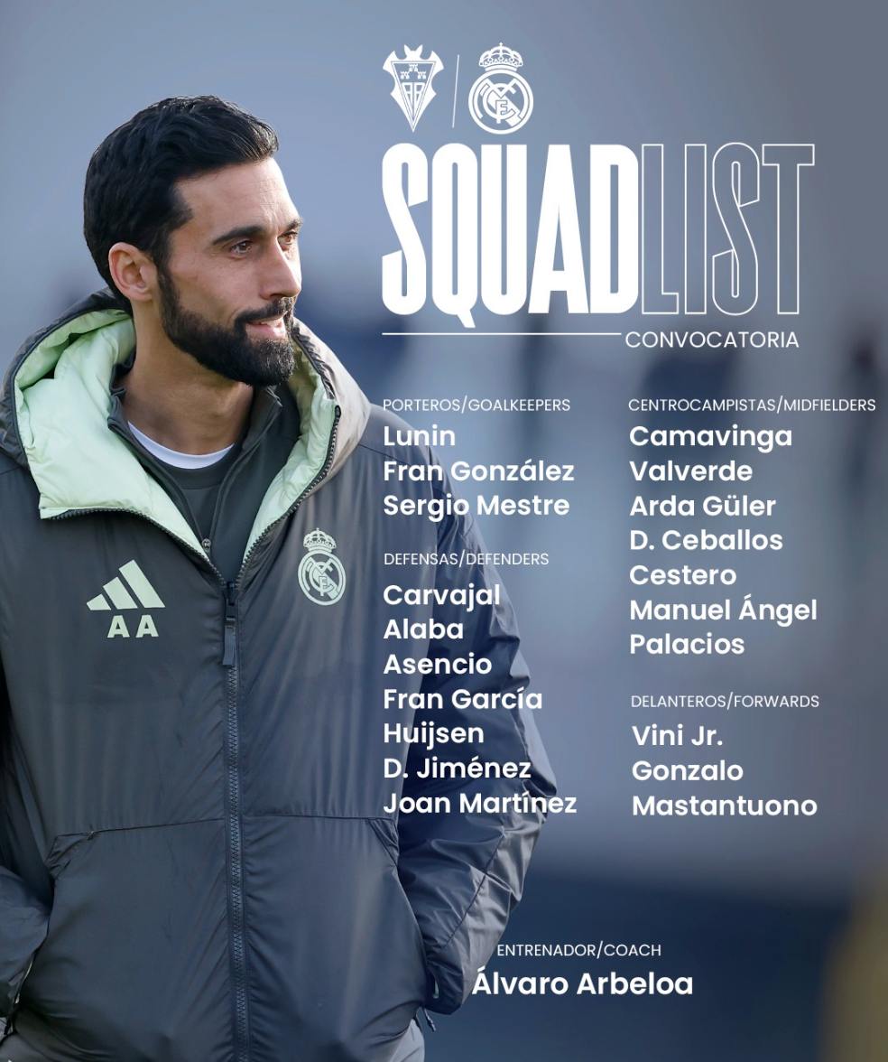 Новий головний тренер "Реала" Альваро Арбелоа визначився з переліком гравців, на яких він розраховує у сьогоднішньому матчі Кубка Іспанії проти "Альбасете".