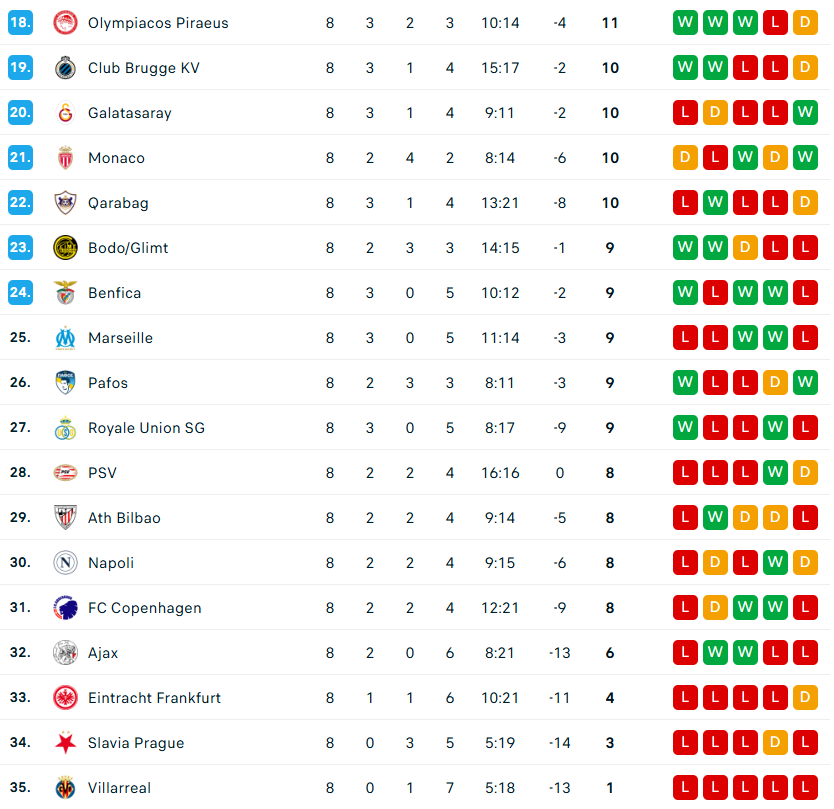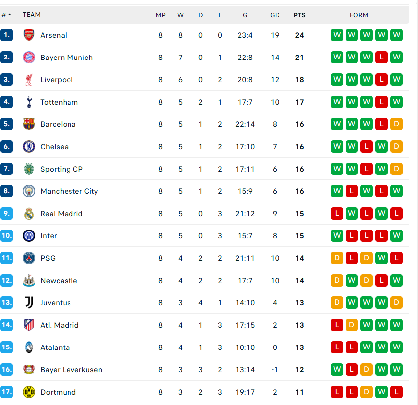 Пропонуємо до Вашої уваги підсумкову турнірну таблицю основного раунду Ліги чемпіонів.