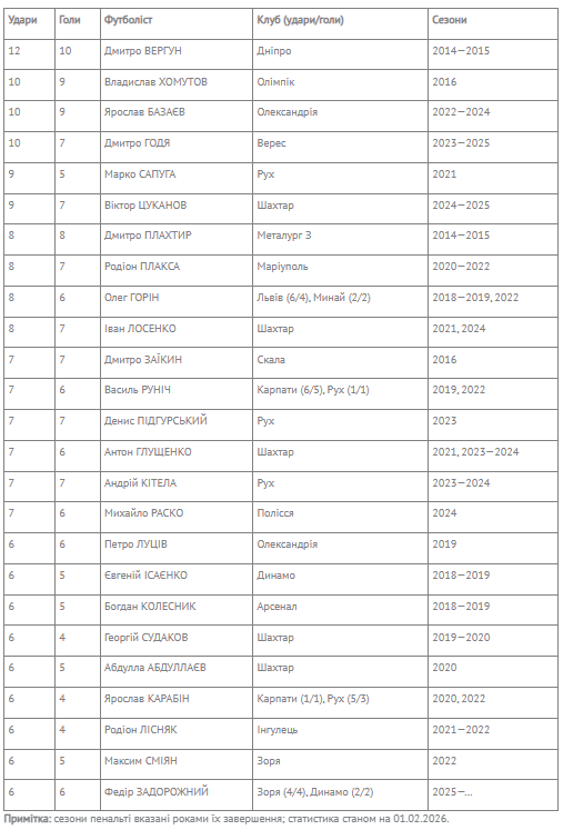 Очолює ж цей рейтинг ще з 2015 року Дмитро Вергун («Дніпро»), який 12 разів виконував 11-метрові удари, забивши 10 голів.