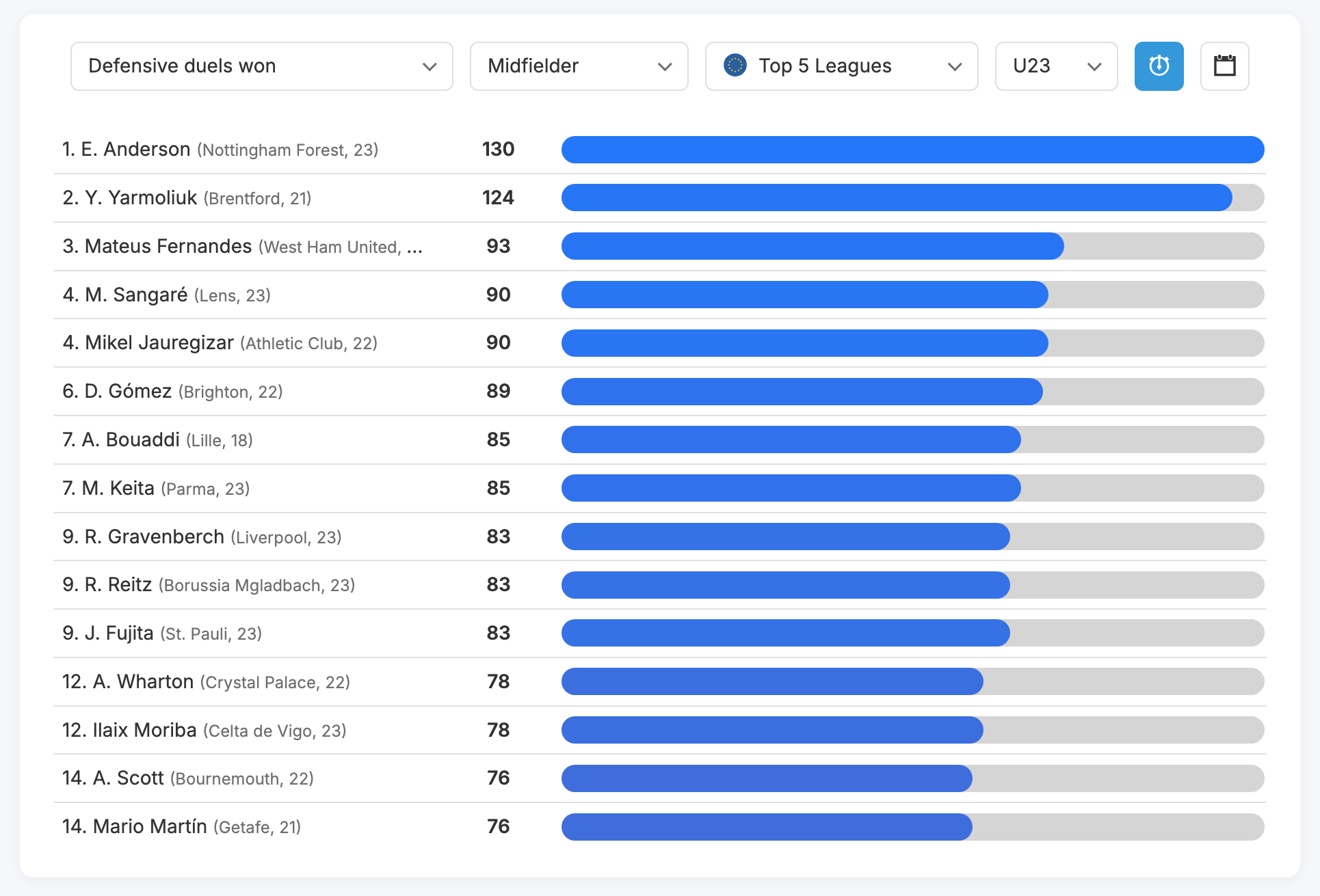 Український півзахисник "Брентфорда" Єгор Ярмолюк посідає друге місце серед хавбеків віком до 23-х років у топ-5 чемпіонатах за кількістю виграних захисних єдиноборств.