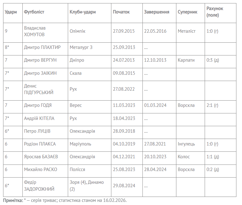 Найдовші стартові серії реалізацій пенальті одним футболістом у Національній Лізі U-19