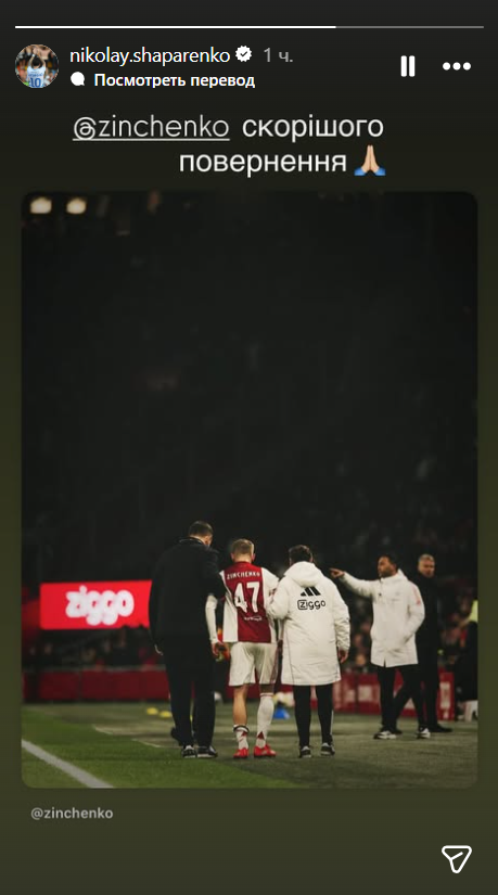 Півзахисник "Динамо" Микола Шапаренко у своєму Instagram підтримав Олександра Зінченка, який не зіграє цього сезону через травму.