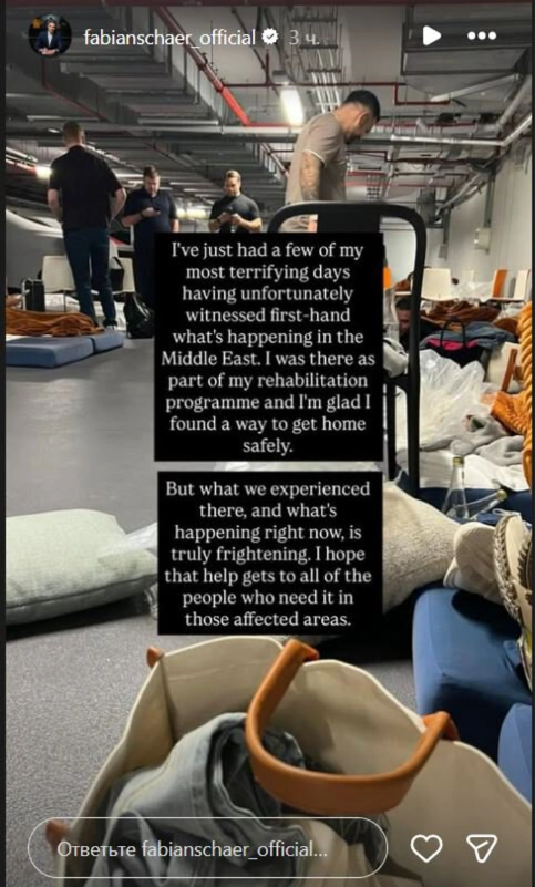 34-річний футболіст, який проходив в ОАЕ процес реабілітації після травми, виклав у сторіс інстаграма фотографію, на якій він сидить у сховищі разом з іншими людьми.