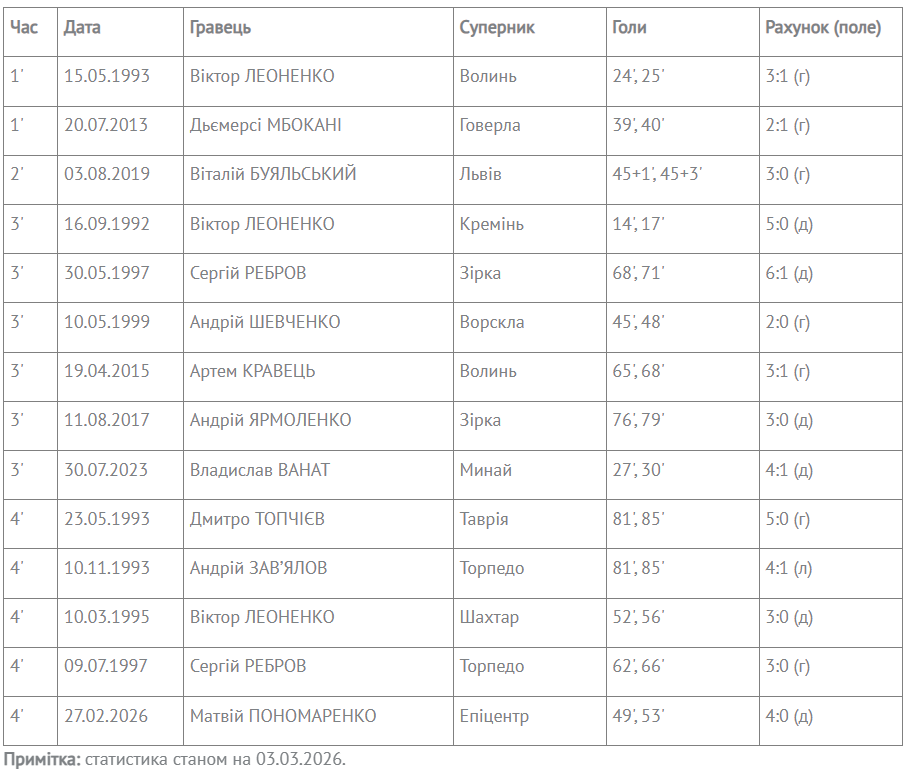 Авторами всеукраїнського рекорду є 19 гравців, які оформлювали дублі з інтервалом в одну хвилину. Серед них зокрема двоє представників «Динамо» — Віктор Леоненко та Дьємерсі Мбокані.