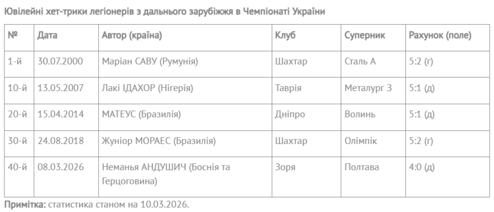 Неманья Анджушич став автором 40-го хет-трика легіонерів з дальнього зарубіжжя в УПЛ