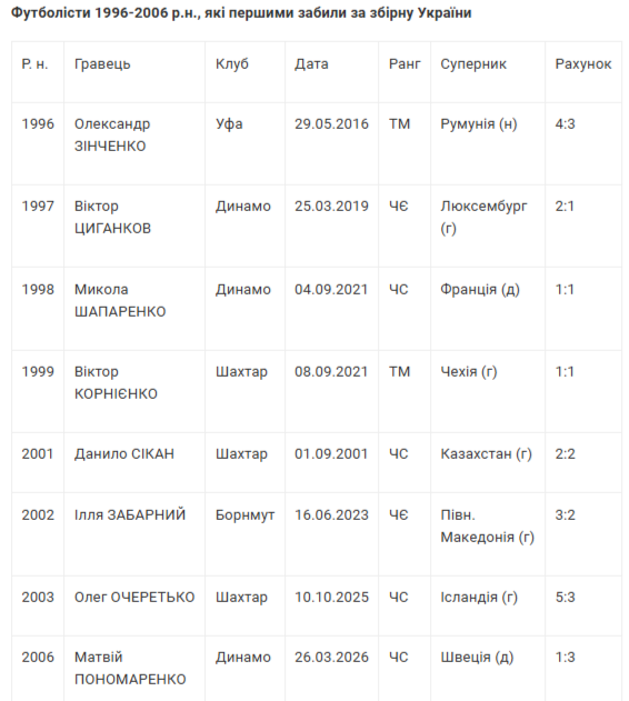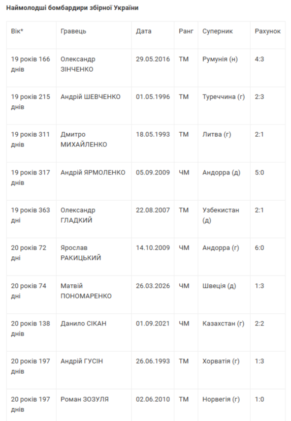 Нападник "Динамо" Матвій Пономаренко увійшов до десятки наймолодших бомбардирів збірної України.