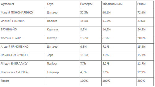 Повні результати голосування серед футболістів