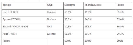 У тренерів переконливу перемогу здобув керманич «Динамо» Ігор Костюк — він зібрав більше 40% голосів і серед експертів, і серед уболівальників. В сумі вийшло 85,4%.