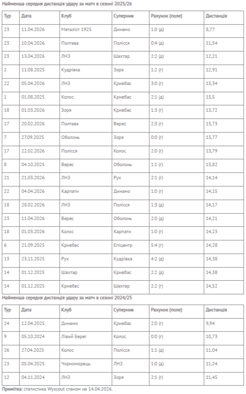 Середня дистанція удару в УПЛ за весь сезон 2025/26 дорівнює 18,9 м. Найменша середня дистанція удару за сезон — у "Полісся" (17,92). До топ-5 цього рейтингу входять також: "Шахтар" (18,03), "Зоря" (18,06), ЛНЗ (18,17) та "Динамо" (18,3).