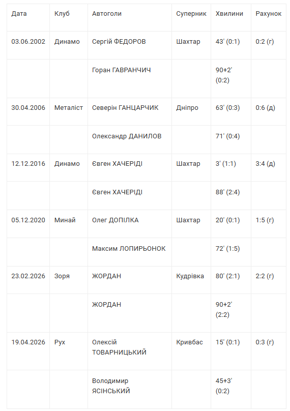 Команди, які забили два м'ячі у свої ворота в одному матчі УПЛ