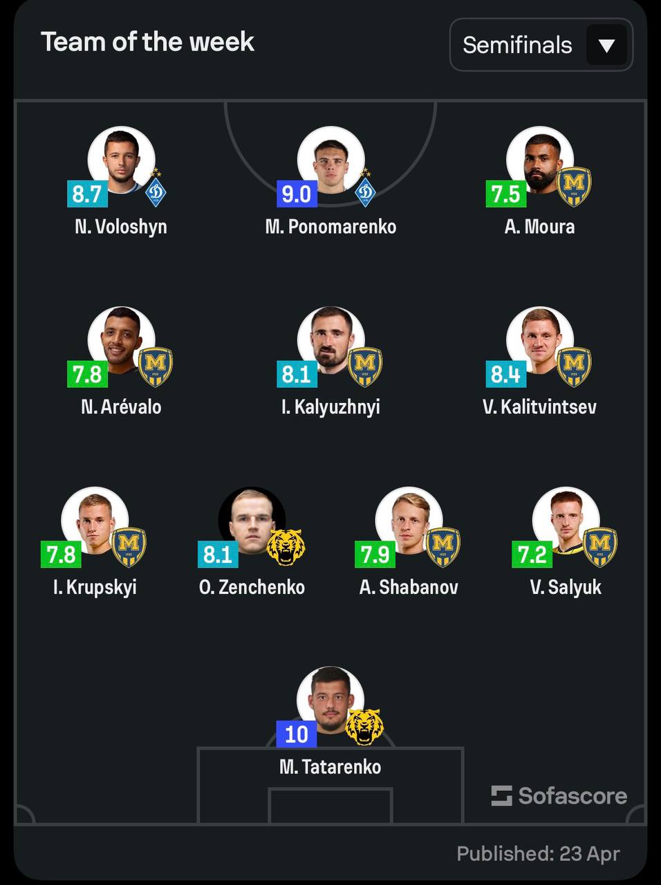 Статистичний портал SofaScore опублікував символічну збірну півфінальних матчів розіграшу Кубка України.