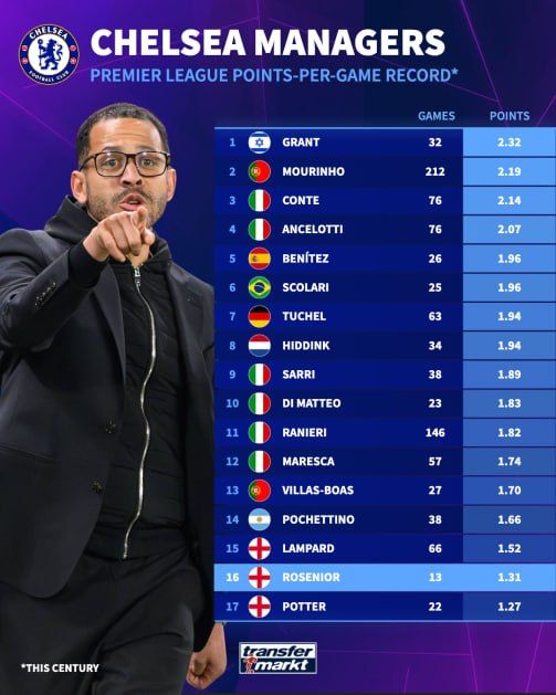 Тільки один тренер був гіршим за Росеньйора за середнім набором очок у "Челсі" в АПЛ у цьому столітті