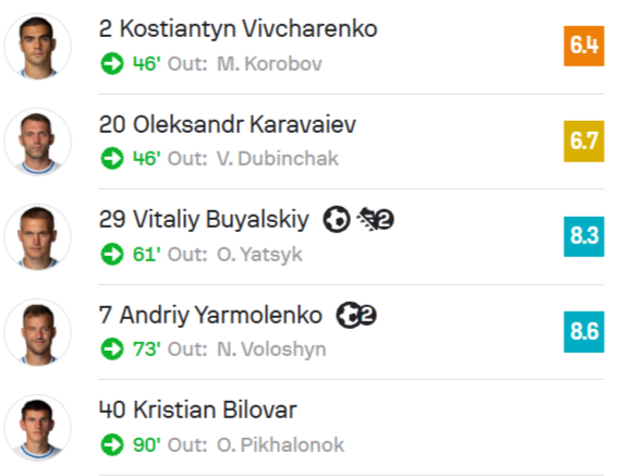 Найвищу оцінку у киян отримав Андрій Ярмоленко (8,6), трохи менший бал у Віталія Буяльського - 8,3.