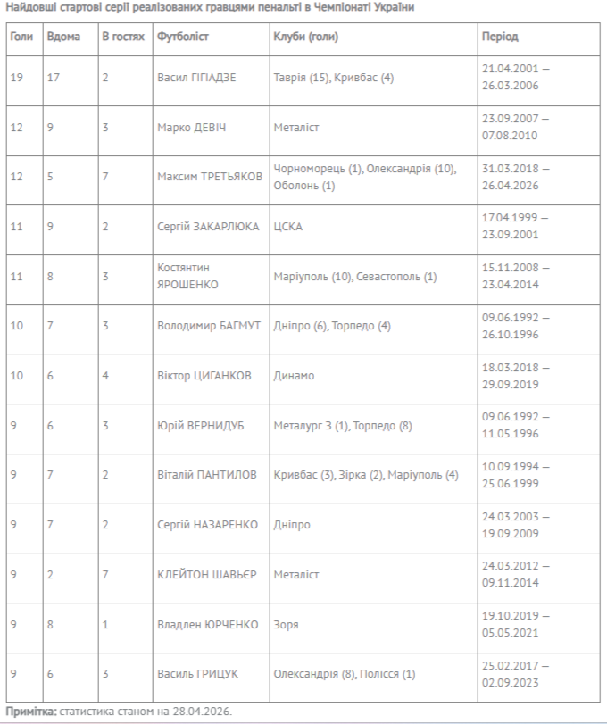 В 25-му турі нинішнього чемпіонату підтвердив своє вміння реалізовувати 11-метрові удари Максим Третьяков з "Оболоні" — у грі з "Поліссям".
