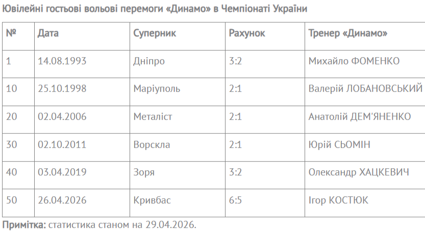 У 25-му турі "Динамо" у Кривому Розі здобуло свою ювілейну, 50-ту, гостьову вольову перемогу в чемпіонаті України ("Кривбас" — 6:5).