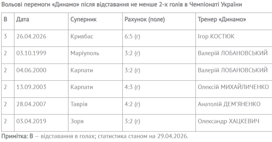Раніше відбулися 5 матчів, в яких динамівці в гостях поступалися по ходу гри з різницею у 2 голи, але в підсумку перемагали.