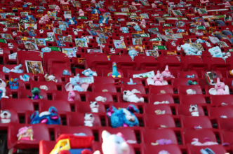 176 іграшок розклали на трибуні перед матчем "Шахтаря" та "Олімпіакоса" на честь загиблих у війні дітей