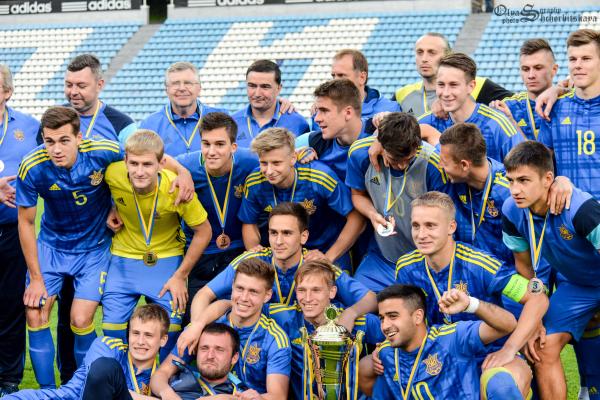 Молодежная сборая Украины празднует завоевание бронзовых медалей на момориале Лобановского