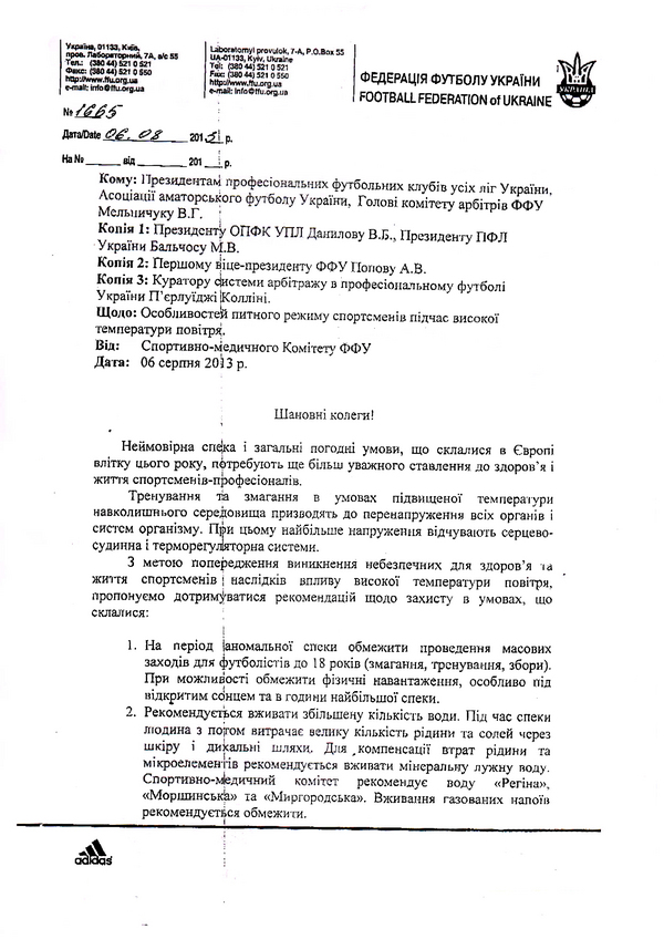 Сергей Михайлович рассылает за своей подписью рекомендации, как защитить здоровье и жизнь спортсменам-профессионалам в условиях неимоверной жары (смотрите ниже). Помимо этого, доктор Стороженко готов даже устроить «прием», значится в письме неудавшегося адвоката: «Звертайтесь до нас без будь яких коливань». Действительно, если «коливання» уже наступят, помочь смогут лишь профессиональные врачи, а не аферисты-прокуроры наверху украинского футбола.