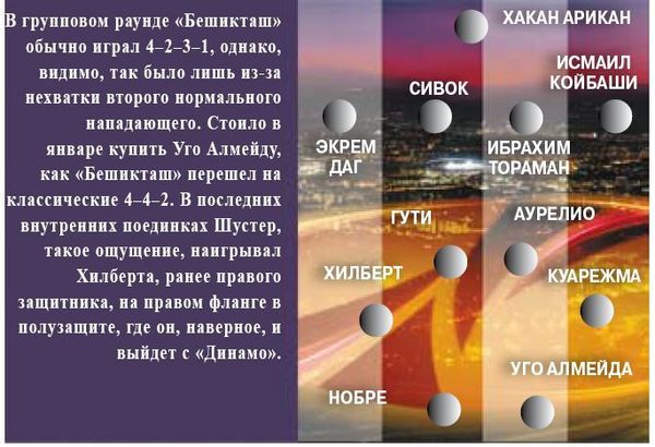 Закроем глаза на историчность данной пары и на то, а именно: единственный раз, когда турецкий клуб прошел украинский, это именно «Бешикташ» – киевское «Динамо». С той поры в клубах изменилось очень много, от тренеров до игроков, а у «Бешикташа» и президент новый. Достаточно сказать, что у «Бешикташа» с того состава восьмилетней давности остался только капитан команды Ибрахим Узульмез (Мехмет Аурелио, Мерт Нобре имеют опыт встреч с «Динамо» в составе «Фенербахче», Гути – мадридского «Реала», а Феррари – «Ромы»). У «Динамо» таких игроков четверо – Шовковский, Несмачный, Гиоане и травмированный Эль-Каддури. В общем, сравнивать не с чем и незачем.