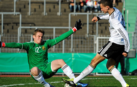 А ось німці забили тричі. На 42-й хвилині рахунок відкрив Крістофер Бачтманн, на 79-й відзначився Кевін Фолланд, а перед фінальним свистком м’яч у власні ворота зрізав Руслан Бабенко. Нагадаємо, що українська збірна наразі готується до відбірного еліт-раунду ЧЄ-2011 (U-19). Вона потрапила до 4-ї групи, ігри якої проходитимуть у Польщі з 16 по 21 травня. За єдину путівку до Румунії наші співвітчизники змагатимуться з господарями, італійцями та ірландцями.