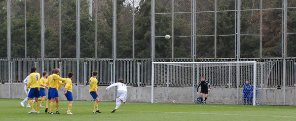Когда тайм уже подходил к концу, киевляне открыли счет. Гол получился очень красивый. Морозенко, до этого несколько раз пристреливавшийся с дальних дистанций, исполнил штрафной просто на заглядение. До ворот было тридцать метров, но это не помешало Евгению вонзить мяч точно в правую девятку.