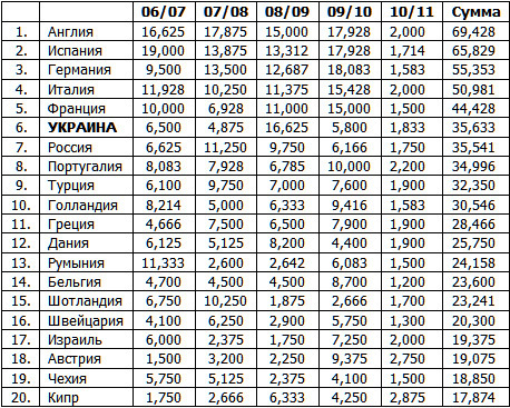 5. Красным цветом выделены названия стран, сохраняющих представителей в еврокубках сезона 11/12.