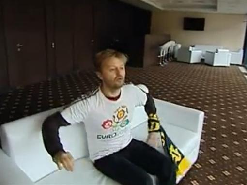 Она спрятана за пуленепробиваемым тонированным стеклом рядом с VIP-ложей. Длинная комната (примерно 10 на 40 метров) рассчитана на 76 человек, которые будут здесь смотреть футбол на белых кожаных диванчиках. Есть тут мини-бар, а также индивидуальный лифт для президента. Нас туда не пустили, ссылаясь на ремонт (ложа полностью еще не оборудована). А вот тележурналист канала ICTV, друг Евро Микола Васильков (на фото), смог прорваться и даже посидел на президентском диванчике.
