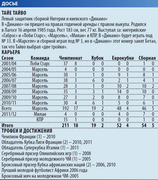 При этом он неплохо играет головой, хотя это не главное для флангового защитника. У Тайво в «Динамо» полно соотечественников, которые помогут ему побыстрее адаптироваться, что очень важно для игрока, арендованного на короткий срок. Более того, Юссуфа Тайво называет своим другом (они не один матч провели вместе в сборной Нигерии, в том числе и на ЧМ в ЮАР).