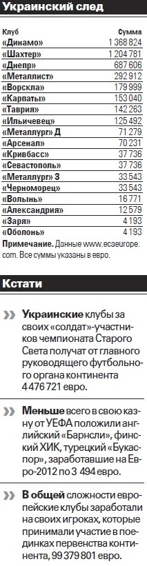 К тому же, если взглянуть на общий заработок УЕФА на польско-украинском турнире, то можно понять, что выплачиваемая клубам сумма почти в 100 «лимонов» евро – капля в море. Ведь не так давно операционный директор УЕФА Мартин Каллен рассказал журналистам, что суммарный доход его организации от проведения Евро2012 составил 1, 383 миллиарда в европейской валюте. В эту сумму, напомним, поместились 815 миллионов от продажи прав на телевизионные трансляции матчей европейского первенства, 22 миллиона от услуг за так называемую одностороннюю трансляцию, 315 миллионов от спонсорской поддержки и продажи лицензий, 101 миллион от продажи пакетов гостеприимства и 130 миллионов от продажи билетов на поединки турнира. Конечно, стоит учитывать и выплату призовых от УЕФА сборным участницам финального турнира, которая составила 196 миллионов евро, и эта цифра в более чем миллиардном море теряется, как овца на фоне быка.