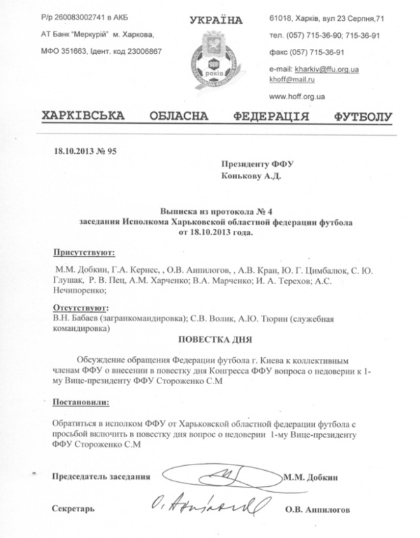 В начале октября Киевская федерация футбола обратилась к футбольной общественности Украины с предложением поддержать решение включить в повестку дня очередного Конгресса ФФУ вопрос о выражении недоверия первому вице-президенту ФФУ Сергею Михайловичу Стороженко. Спустя неделю призыв коллег единогласно поддержала Житомирская федерация футбола. Наконец сегодня стало известно о том, что и Харьковская федерация также обратилась в исполком ФФУ с просьбой включить в повестку дня вопрос о недоверии 1-му вице-президенту ФФУ.