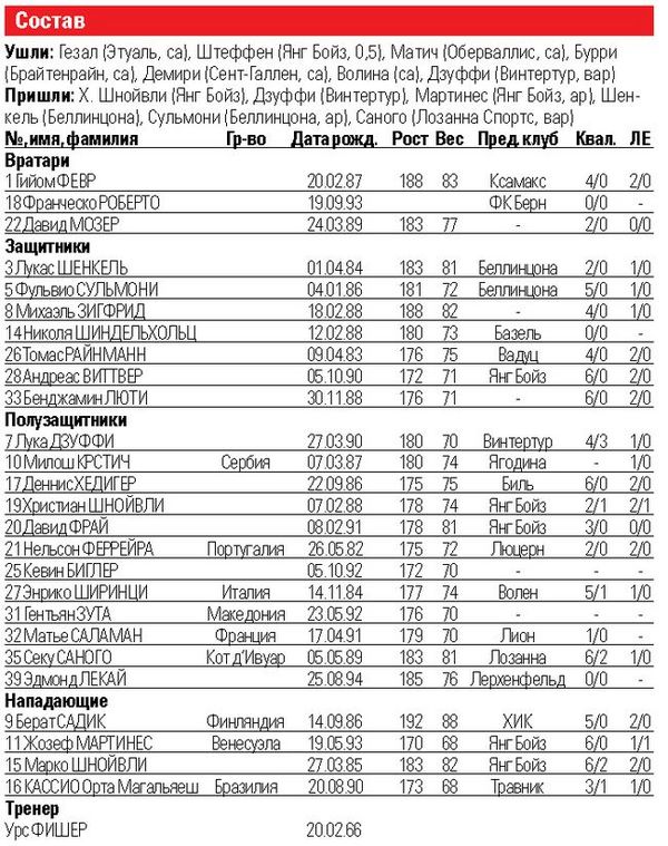 В обороне не подвергается никаким сомнениям место лишь правого защитника Бенджамина Люти. Этот воспитанник клуба – лидер команды по числу проведенного на поле игрового времени и один из двух игроков команды (еще – ее капитан опорник Деннис Хедигер), которые во всех матчах выходили в стартовом составе. Доверие тренера к Люти объясняется отнюдь не тем, что Бенджамин – сын президента клуба! Он действительно очень хороший игрок, чему свидетельство гол и три голевые передачи в первенстве. По числу ассистов он лидер в команде в этом чемпионате. Еще два ассиста он записал в свой актив в еврокубках.