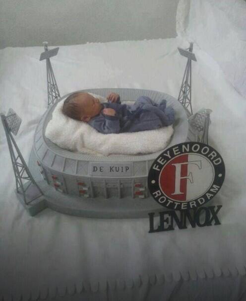 Изобретатель явил миру фотографию, на которой его новорожденный сын Леннокс, крепко спит в кроватке – мини копии клубного стадиона «Фейенорда» «Де Кейп».
