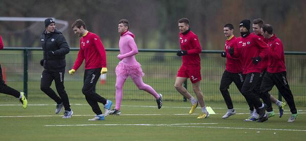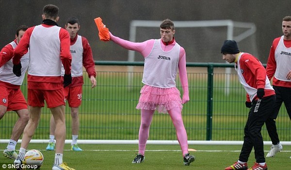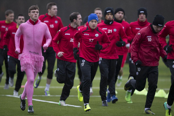 Оригинальное наказание придумали для лентяев в шотландском клубе «Патрик». Первой жертвой новой методики стал 19-летний Гари Фрейзер, который, по мнению наставника, на протяжении предыдущей недели был худшим на тренировочных занятиях. Дабы искупить свою вину футболист вынужден был выйти на тренировку в розовом трико, такого же цвета лосинах и балетной пачке! Благо обувь оставили футбольную – бутсы.