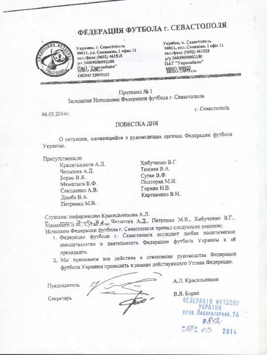 Севастопольские футбольные функционеры выступили с осуждением политического вмешательства в деятельность ФФУ и ее президента Анатолия Конькова, а также призывают все действия проводить в рамках действующего Устава ФФУ.