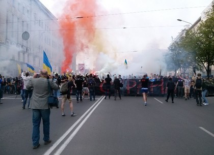 Участники шествия используют петарды и пиротехнику. Она скандируют «Слава Украине, героям слава» и «Україна понад усе».