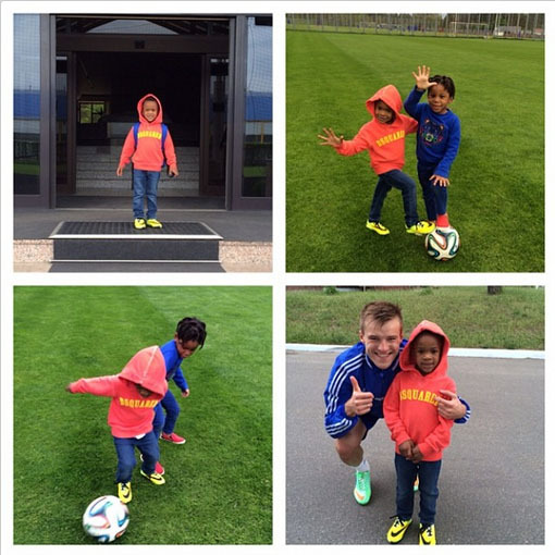 Нападающие киевского «Динамо» Браун Идейе и Дьемерси Мбокани решили с ранних лет приобщать своих детей к футболу. Легионеры привели сыновей на базу киевского клуба, где они смогли погонять мяч на одном из тренировочных полей, а также сфотографироваться с игроками команды. «Говорят, яблоко от яблони не далеко падает», — написал Браун в комментарии к выложенным в Instagram фотографиям.