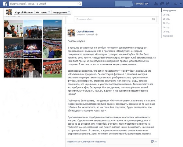 Після того, як у соціальній мережі, на адресу сюжету в програмі "Профутбол", від 27 квітня цього року, відповів користувач - "Сергей Палкин" я довго не міг заснути. "А раптом в суд подасть, за наклеп чи викривлення інформації?" – усю ніч відмахувався від подібних думок-страшилок. А вранці, сів перечитав ще раз його, без сумніву, змістовну відповідь по всіх тезах сюжету і якось одразу заспокоївся.