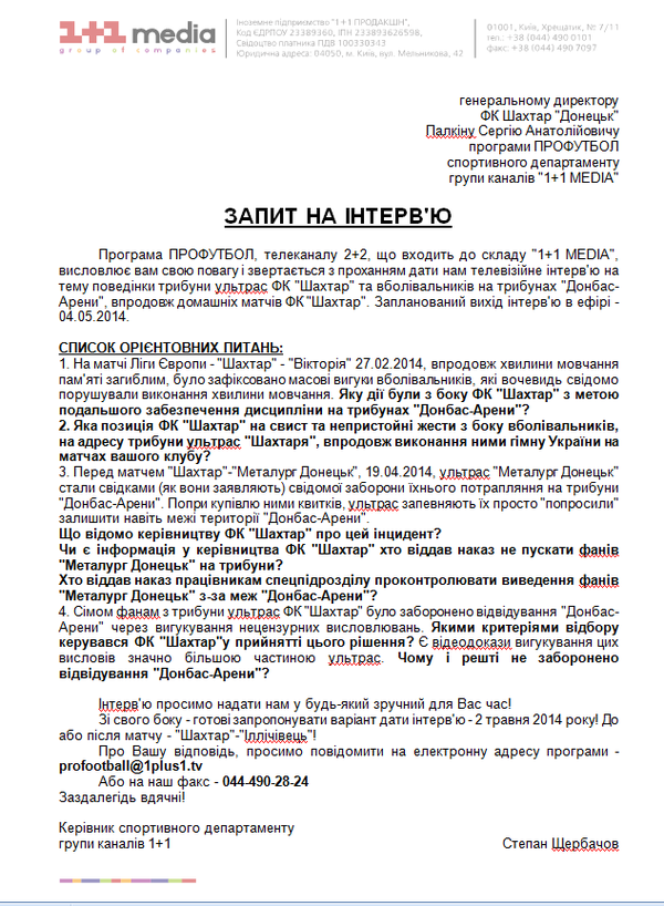 А щоб остаточно розвіяти всі закиди стосовно неупередженості цього сюжету - офіційно повідомляю і заявляю - 30 квітня 2014 року, близько 10 ранку, у робочий для України день, до приймальні генерального директора ФК "Шахтар" Сергія Палкіна відправлено факс від програми "Профутбол". Із пропозицією телеінтерв'ю. Ба, навіть теми у факсі озвучено і перелік питань. Він власне, мало чим відрізняється від викладених тем у сюжеті, але чомусь проігнорованих у відповіді користувача соцмережі - "Сергей Палкин" на адресу "Профутболу". Місце у ефірі для, без сумніву цікавої розмови, із, без сумніву хвилюючими темами, не лише для вболівальників донецького "Шахтаря" - знайдеться! Ось тільки відповіді "Профутбол" і досі не побачив!