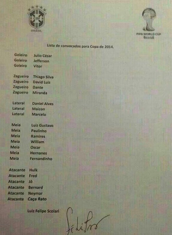 В Интернете появился заявочный лист сборной Бразилии на чемпионат мира 2014 года за подписью Луиса Фелипе Сколари.