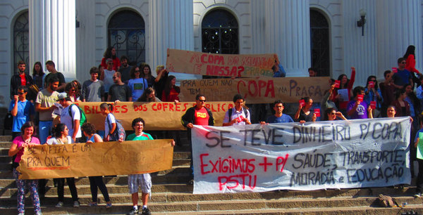 Ну не хотят они, чтобы ЧМ проходил в их штате. Чтобы показать это, они изготовили множество баннеров, разучили кричалки. Общий смысл протестов таков: что нам даст этот чемпионат мира? Для кого он проводится? Нужен ли он жителям Бразилии в тот момент, когда так остро стоят социальные проблемы? Ролик об этой манифестации вы можете посмотреть на нашей канале в Ютубе.