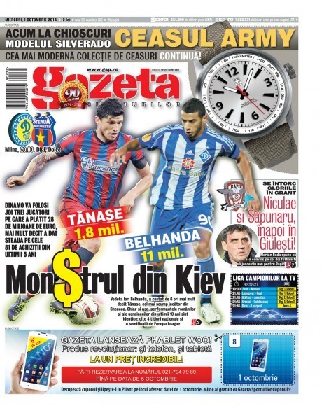 Самое популярное спортивное издание Румынии Gazeta sporturilor сегодня вышло с шапкой "Монстры из Киева". Так румынские журналисты обозвали соперника бухарестской "Стяуа" в Лиге Европы – киевское Динамо". По их подсчетам www.gsp.ro киевский клуб только за трех игроков заплатил столько же (28 млн евро) сколько "Стяуа" позволила себе потратить на 81 трансфер за последние пять лет.