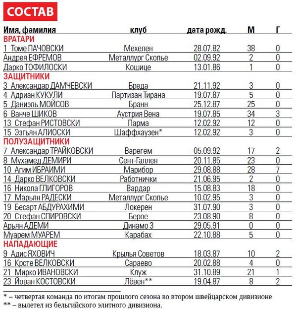 В результате всех этих потерь в сборной Македонии не осталось ни одного игрока, проведшего более сорока матчей за сборную, и только два игрока – вратарь Пачовски и центральный защитник Шиков (тоже наш хороший знакомый, три сезона в Луцке отыгравший, а летом перебравшийся в венскую «Аустрию») – с багажом более тридцати. Наконец, только один игрок сборной – Агим Ибраими – забил более трех голов!