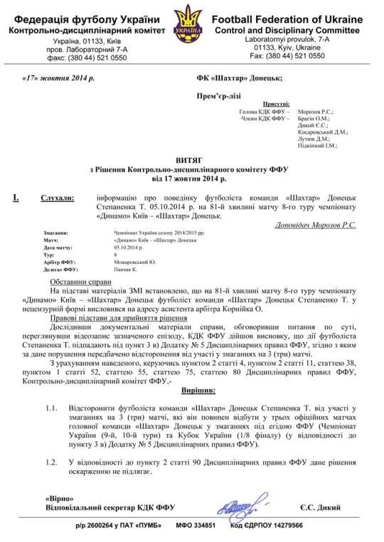 - Для того чтобы разобраться в этом вопросе, необходимо вернуться к хронологии событий. 17 октября в 12:00 состоялось заседание КДК ФФУ, на котором было принято решение отстранить Степаненко на три матча. Полный текст вердикта был направлен в Премьер-лигу: в нем перечислены конкретные матчи, от участия в которых отстранен Степаненко, в чем могут убедиться все желающие (копия решения ниже – прим.). Во второй половине того же дня Премьер-лига получила письмо от МВД с просьбой о переносе всего 10-го тура на более поздние сроки в связи с проведением в стране выборов народных депутатов. На основании этого Дирекция приняла соответствующее решение вечером того же дня.