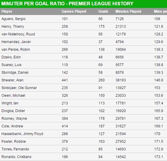 На втором месте оказался легендарный француз Тьерри Анри - 121,8 минуты на гол, а тройку замкнул знаменитый манкунианец Рууд ван Нистелрой - 128,2 минуты.