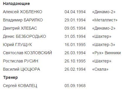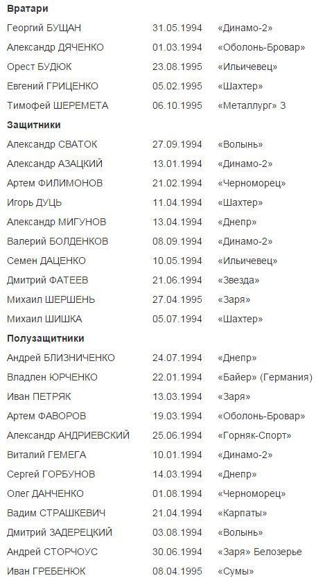 Отметим также, что в списке нет нескольких игроков 1994 года рождения, которые уже успели зарекомендовать себя на уровне Премьер-лиги. Например, защитник Денис Мирошниченко, полузащитники Амбросий Чачуа (оба – «Карпаты»), Дмитрий Мишнев, Сергей Гринь (оба – «Ильичевец»), Игорь Жураховский («Металлург» З), нападающий Тарас Пучковский («Карпаты»). Можно вспомнить также полузащитника Владислава Павленко («Говерла»), который, впрочем, в последнее время выступал в молодежном чемпионате, а не ПЛ.